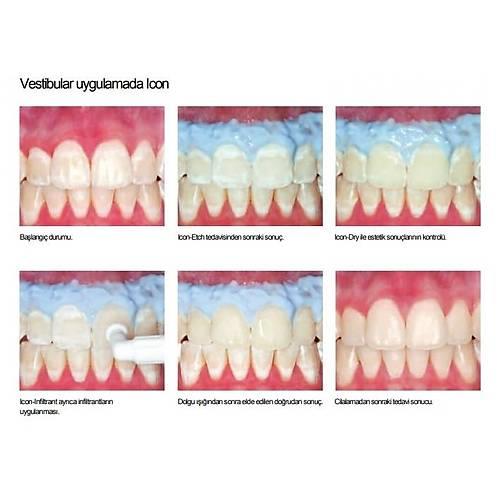 - İnfiltrant Uygulaması (Icon Infiltrant): Düşük viskoziteli reçine, açılan gözeneklere nüfuz eder ve ışıkla kür edilerek sertleşir. Gerekirse ikinci bir kat uygulanır ve cilalama yapılır.