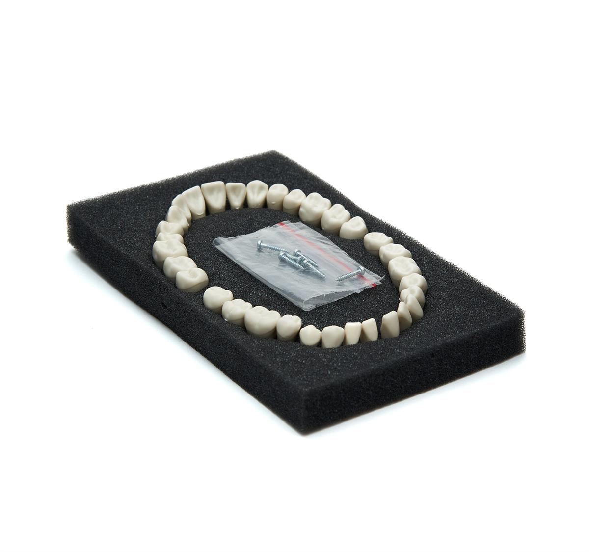 - Kolay Montaj ve Değişim: Dişler, fantom çene üzerindeki yuvalara kolayca takılıp çıkarılabilir. Bu pratik özellik, eğitim sırasında zaman kaybını önler ve öğrencilerin farklı senaryolar üzerinde hızlıca geçiş yapmasına imkan verir. Set, eksilen veya hasar gören dişlerin anında yenisiyle değiştirilmesini sağlayarak eğitim kesintilerini minimize eder.