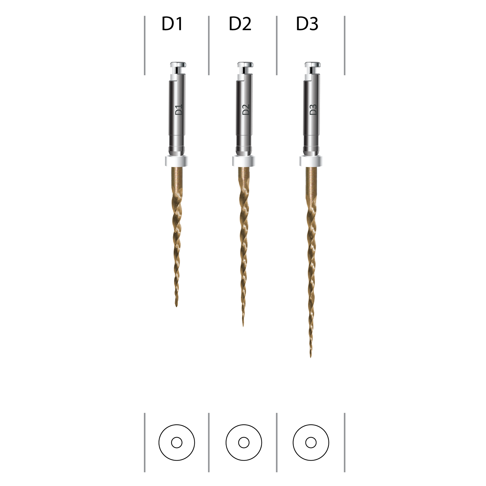 - Sistem, (D1) koronal, (D2) orta ve (D3) apikal üçlüdeki kanal dolgusunu temizlemek için tasarlanmış D1 – D2 ve D3 olmak üzere üç aletten oluşur.