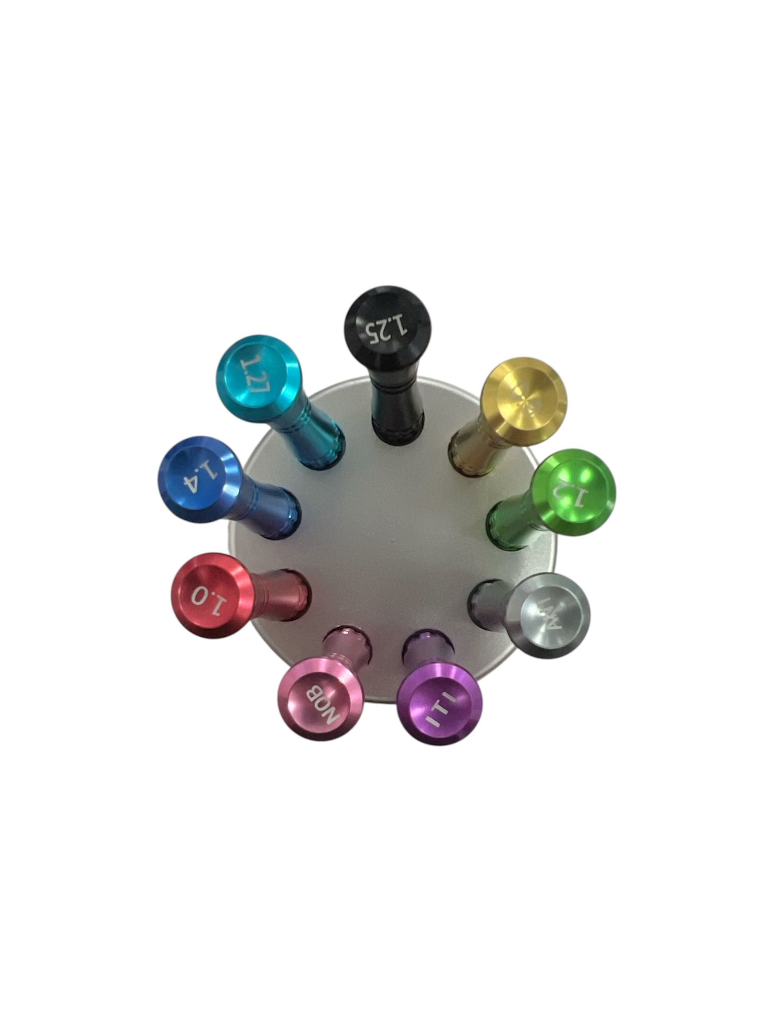 Farklı implant markalarıyla tam uyumlu olan bu set, 9 adet farklı uçlu implant anahtarı ve bu anahtarları düzenli bir şekilde saklamak için özel bir stant içerir.