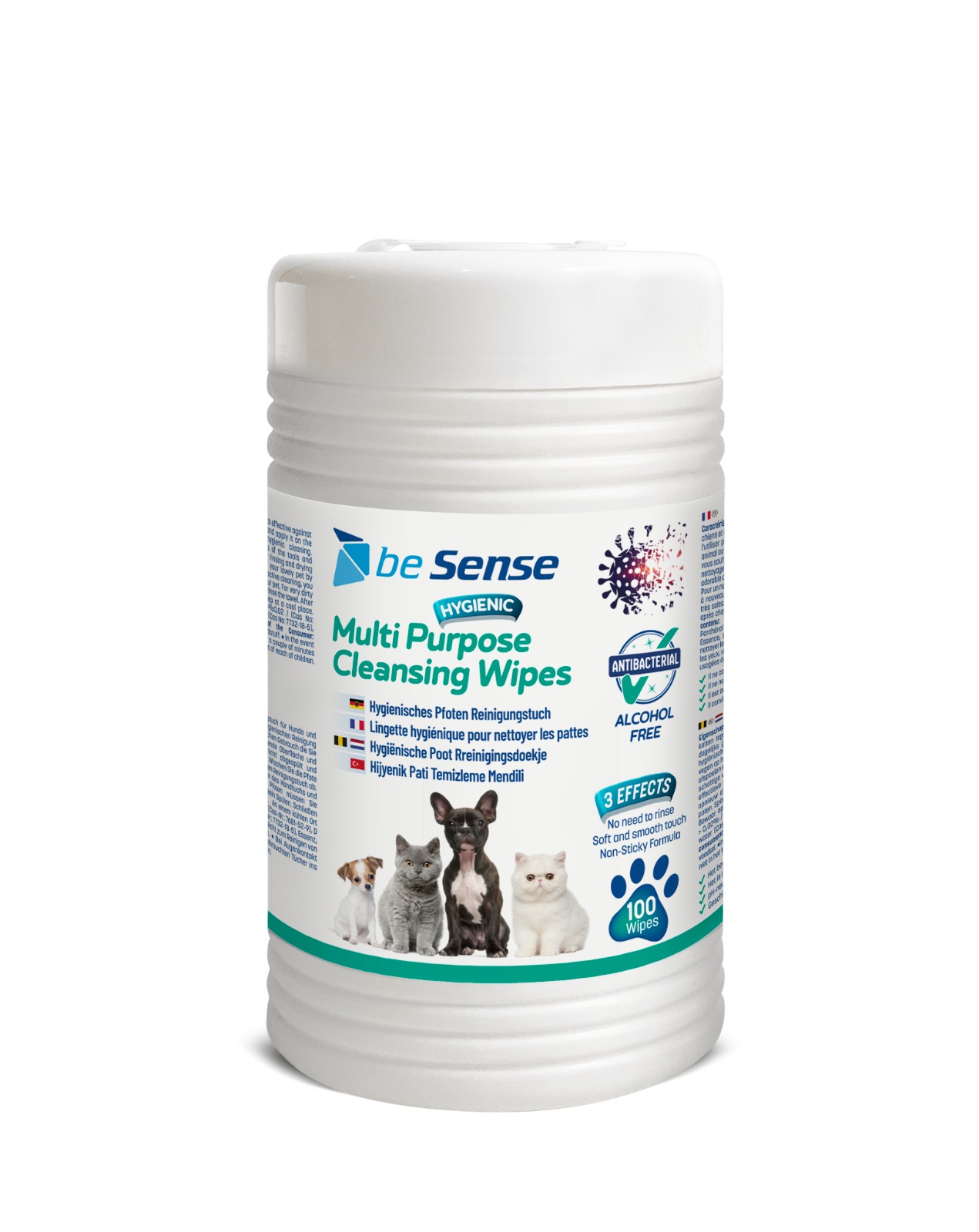 Be Sense evcil hayvan temizleme mendilleri, alkol ve paraben içermeyen, Aloe Vera özlü formülüyle kedi ve köpeklerin pati, vücut ve göz çevresi hijyeni için güvenli, antibakteriyel bir seçenektir