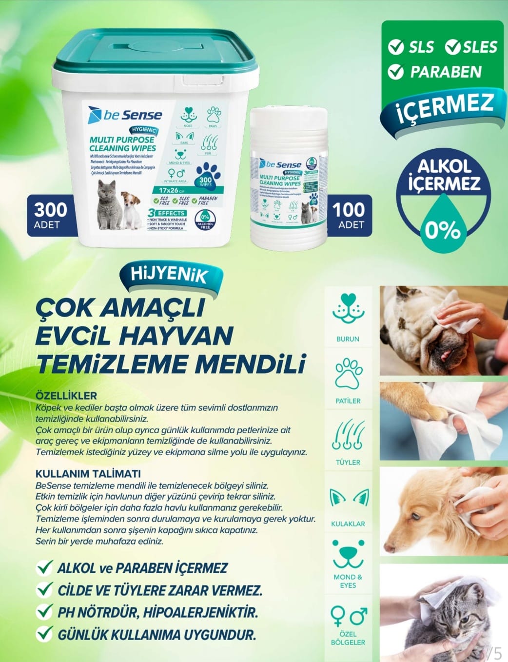 Be Sense evcil hayvan temizleme mendilleri, alkol ve paraben içermeyen, Aloe Vera özlü formülüyle kedi ve köpeklerin pati, vücut ve göz çevresi hijyeni için güvenli, antibakteriyel bir seçenektir