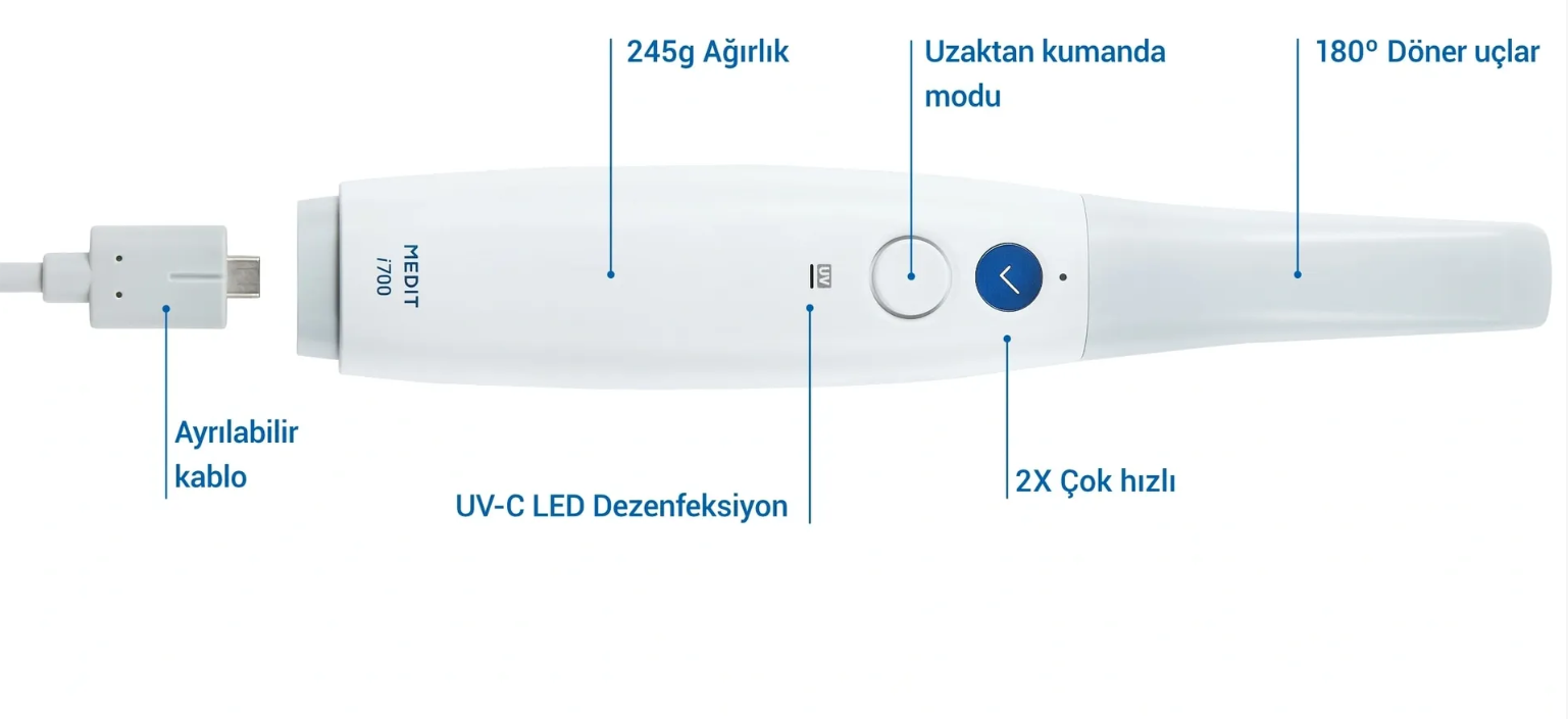 MEDIT i700 Ağız İçi Tarayıcı, dijital diş hekimliğini bir üst seviyeye taşıyan, hızlı, hafif ve yüksek doğrulukta tarama yapabilen son teknoloji bir cihazdır. Estetik ve fonksiyonel restorasyonlar için güvenilir dijital ölçüler almanızı sağlayan i700, hasta konforunu ve klinik verimliliği artırır. Özellikle CAD/CAM sistemleri ile uyumu sayesinde dijital iş akışınıza mükemmel uyum sağlar.